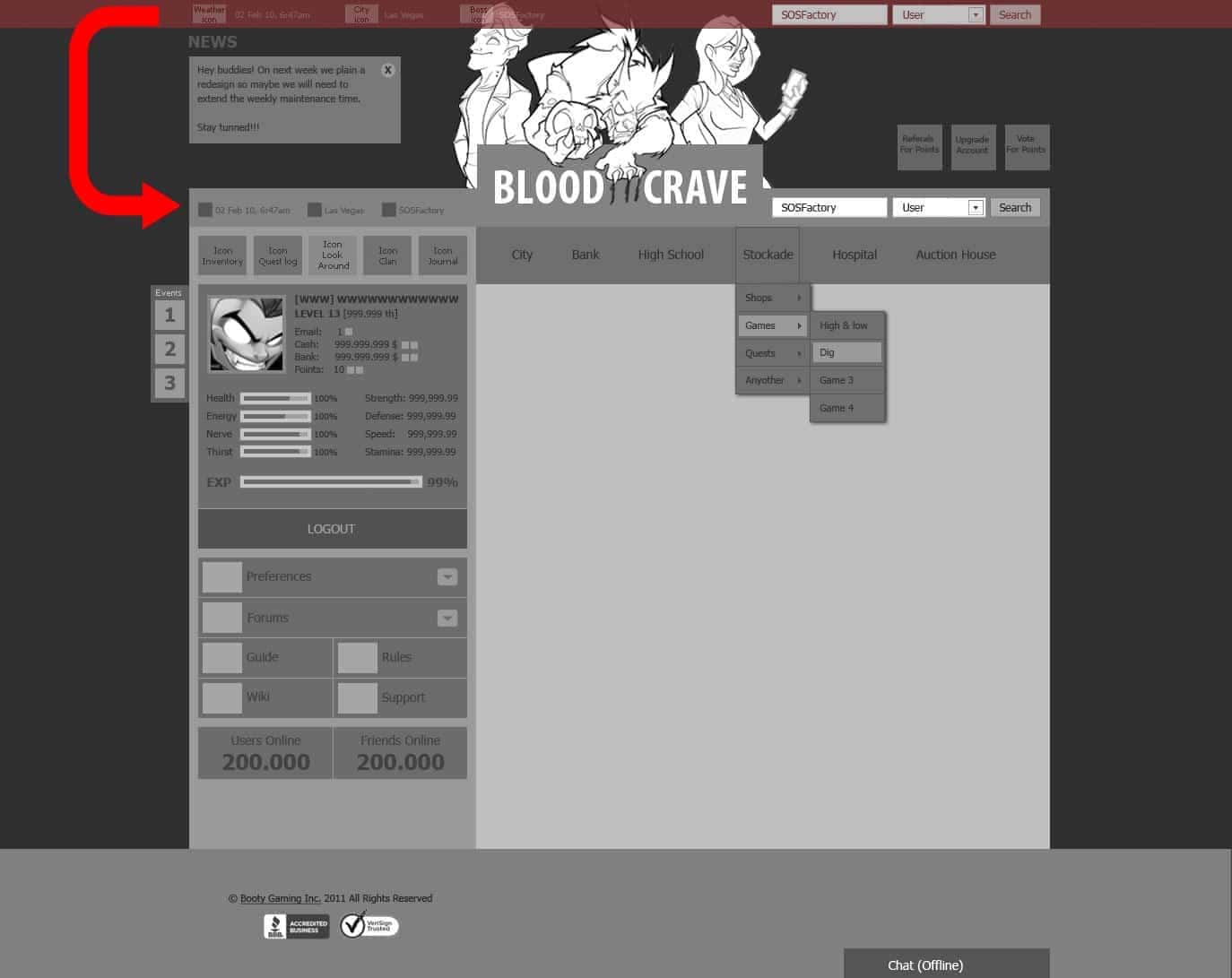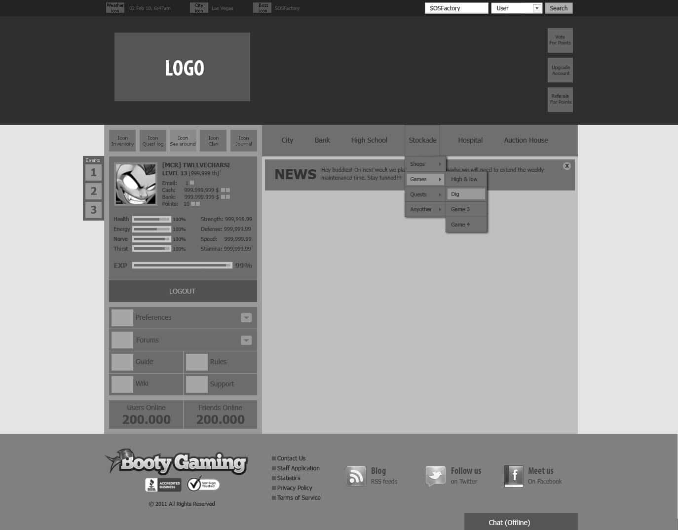 The game’s interface will consist of an illustrative header, a sidebar with the user’s information and with the secondary navigational elements. We also need a main site navigation and an area for premium characteristics as a status bar, search bar and other elements which are normally used in this type of game.