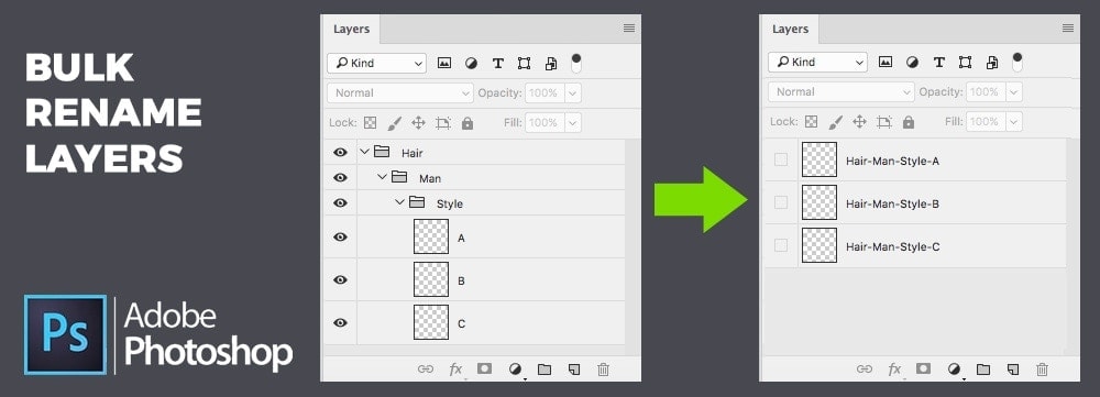 I created a Photoshop script to rename multiple layers based on the structure of the PSD file. It uses folder’s names as prefixes, this way you can rename hundreds of layers in Photoshop with just one click. Additionally you can export multiple layers to files while keeping the names.